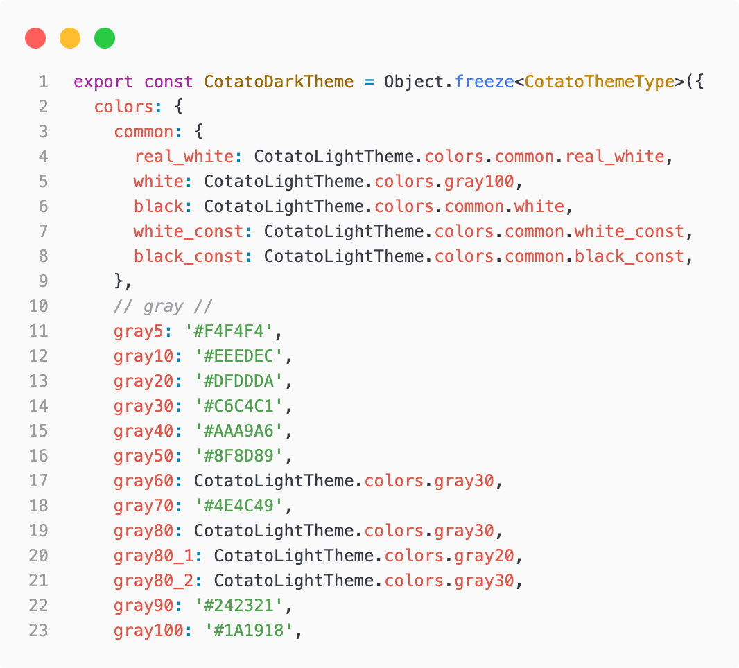 V1에서 개발을 하면서 CSS코드에서 색상을 사용하는 방법은 피그마에 있는 색상 코드를 직접 타이핑하는것이였다. 그렇다 보니 CSS코드에서 색상에 대한 정리가 전혀 되지 않았다. 즉 스타일과 관련된 문서화가 전혀 정리되지 않은 상태였다. 디자이너도 원하는 사용하고 싶은 색상을 그대로 적용하다 보니 라이트모드와 다크모드를 같이 구현하기에 복잡한 수준이였다. V2에서 스타일에 대한 정리를 하기 위해 우선 색상에 대한 정리를 시작했다. 디자인에서 color pallete를 문서로 정리해 프로젝트에서 사용하는 색상은 무조건 pallete에 있는 색으로만 적용을 하고, 라이트모드와 다크모드간에 색상 변환 테이블을 제작했다. 그래서 프론트엔드에서는 색상 코드를 그대로 사용하지 않고, 위의 코드같이 변수화된 색상을 사용하여 색상에 관련해서 디자인 파트와 동기화를 했다. 색상 코드를 변수로 타이핑하고 context API를 통해 전역적으로 사용할 수 있도록 하고, CSS-in-JS인 Styled Component를 통해 변수화된 색상을 사용했다.